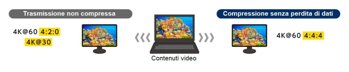 Con segnali video 4K@60 (4:4:4) le immagini vengono trasmesse con una leggera compressione in modalità Loss Less (visivamente senza perdita di dati), con una qualità visiva paragonabile al video originale. “Visivamente senza perdita di dati” significa letteralmente che non c'è alcuna differenza visiva tra il video originale e il video compresso. Il video fino a 4K@60 (4:2:0) o 4K@30 viene trasmesso non compresso.